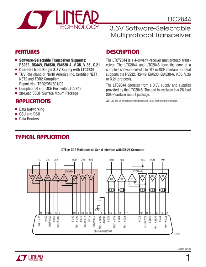 LTC2844 3.3V Software-Selectable Multiprotocol Transceiver