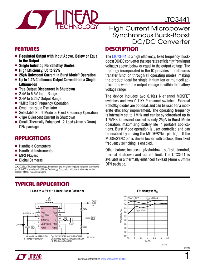 LTC3441 High Current Micropower Synchronous Buck-Boost DC/DC Converter