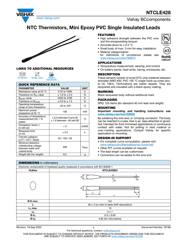 NTCLE428 NTC Thermistors, Mini Epoxy PVC Single Insulated Leads