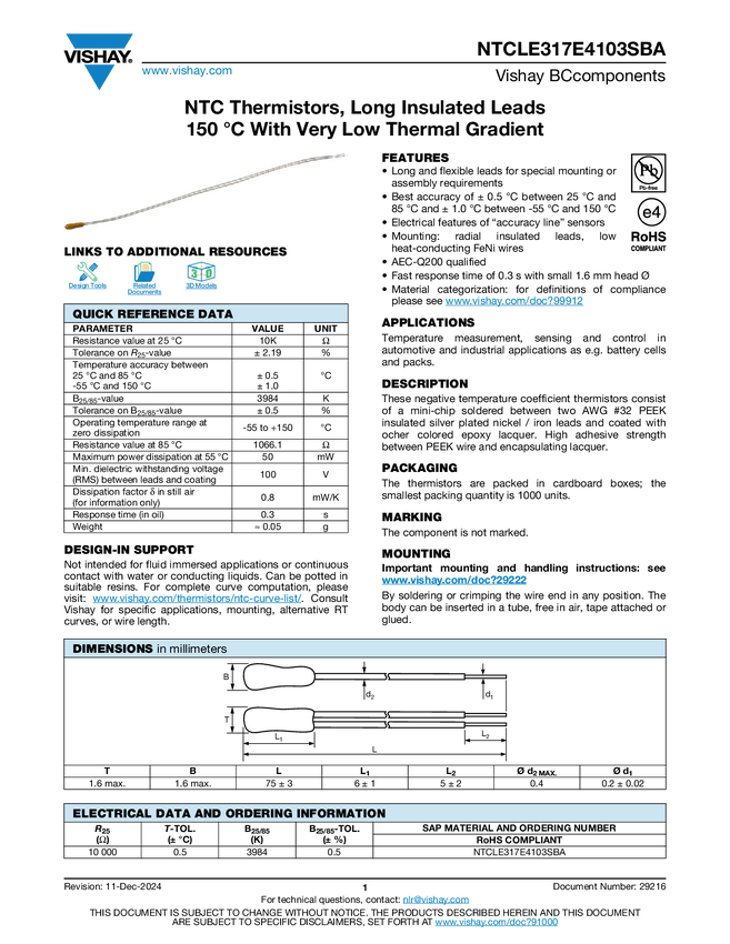 NTCLE317E4103SBA NTC Thermistors, Long Insulated Leads 150 °C With Very Low Thermal Gra...