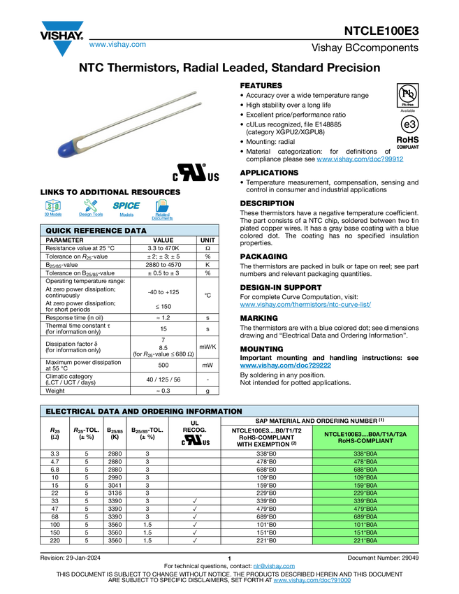 NTCLE100E3 NTC Thermistors, Radial Leaded, Standard Precision