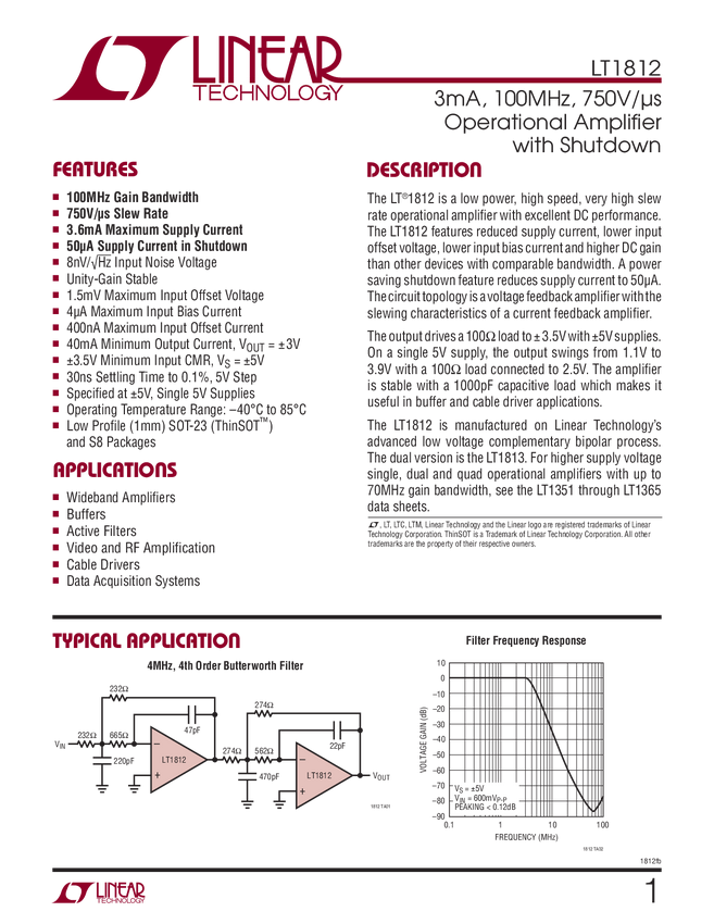 LT1812 3mA, 100MHz, 750V/µs Operational Amplifier with Shutdown