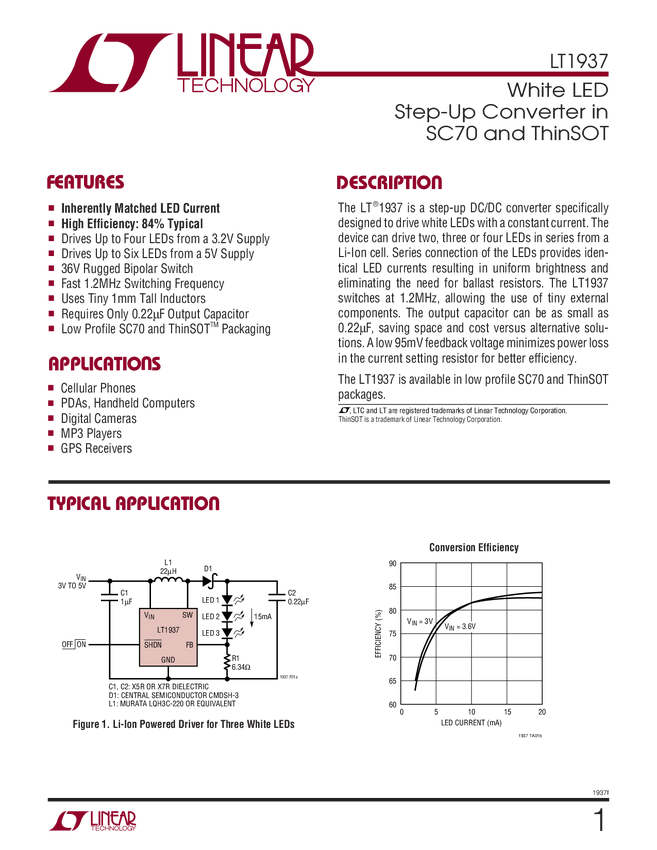 LT1937 White LED Step-Up Converter in SC70 and ThinSOT
