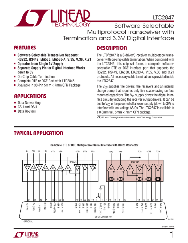 LTC2847 Software-Selectable Multiprotocol Transceiver with Termination and 3.3V Dig...