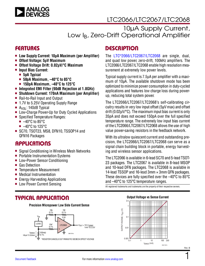 LTC2066 10μA Supply Current, Low I, Zero-Drift Operational Amplifier