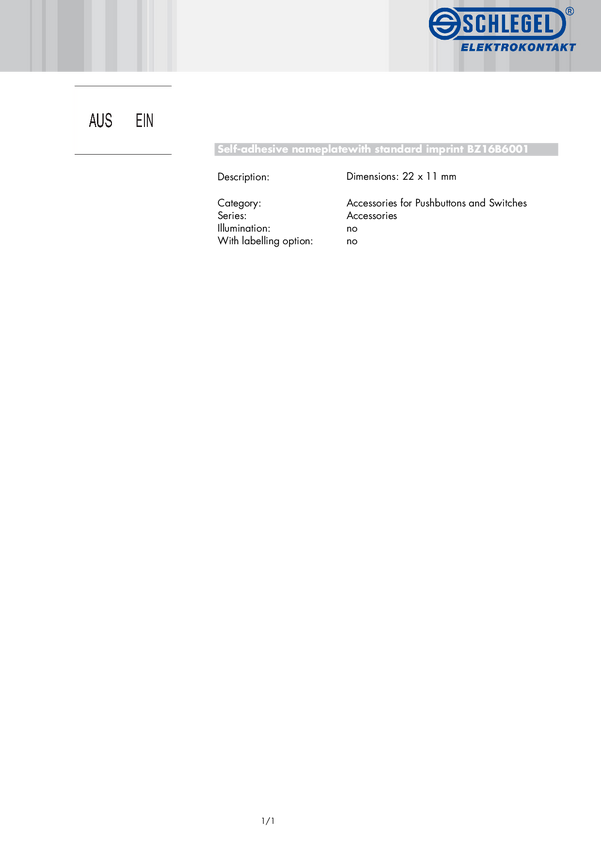 BZ16B6001 Tabliczka opisowa Schlegel BZ16B6001 Tabliczka opisowa EIN/AUS 10 szt.