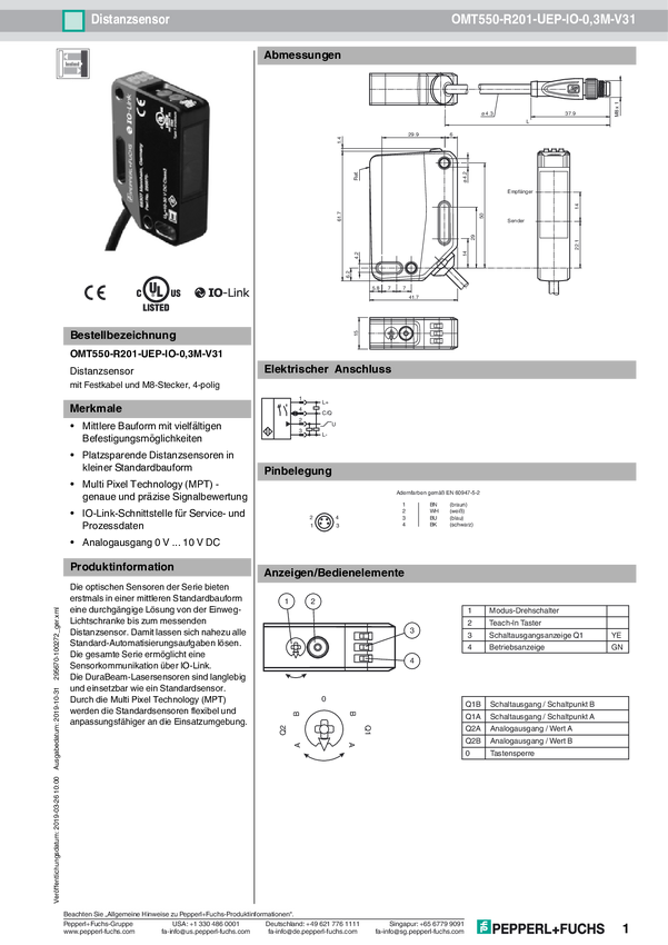 295670-100272 Czujnik odległości Pepperl+Fuchs OMT550-R201-UEP-IO-0,3M-V31 1 szt.