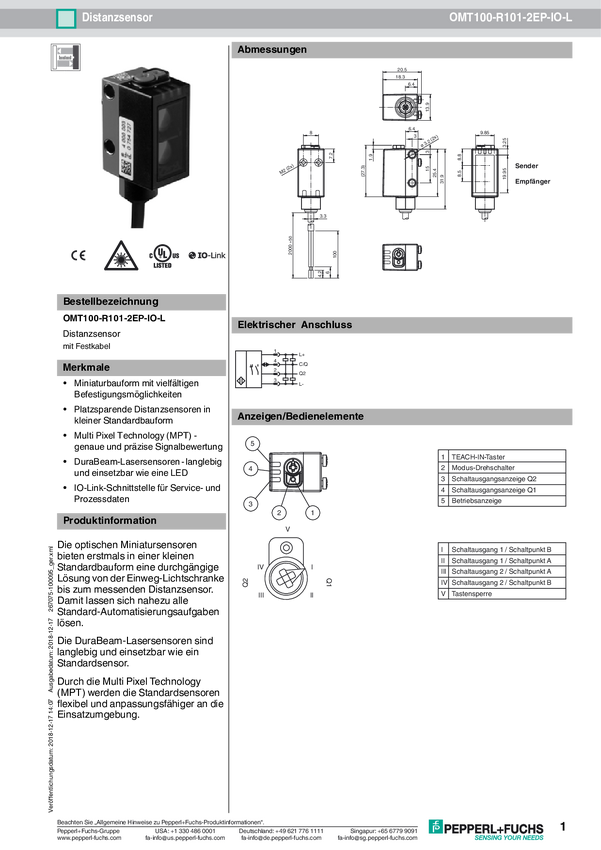 Pepperl+Fuchs OMT100-R101-2EP-IO-L Czujnik odległości 1 szt. (D x S x W) 18.3 x 13.9 x 41.4 mm