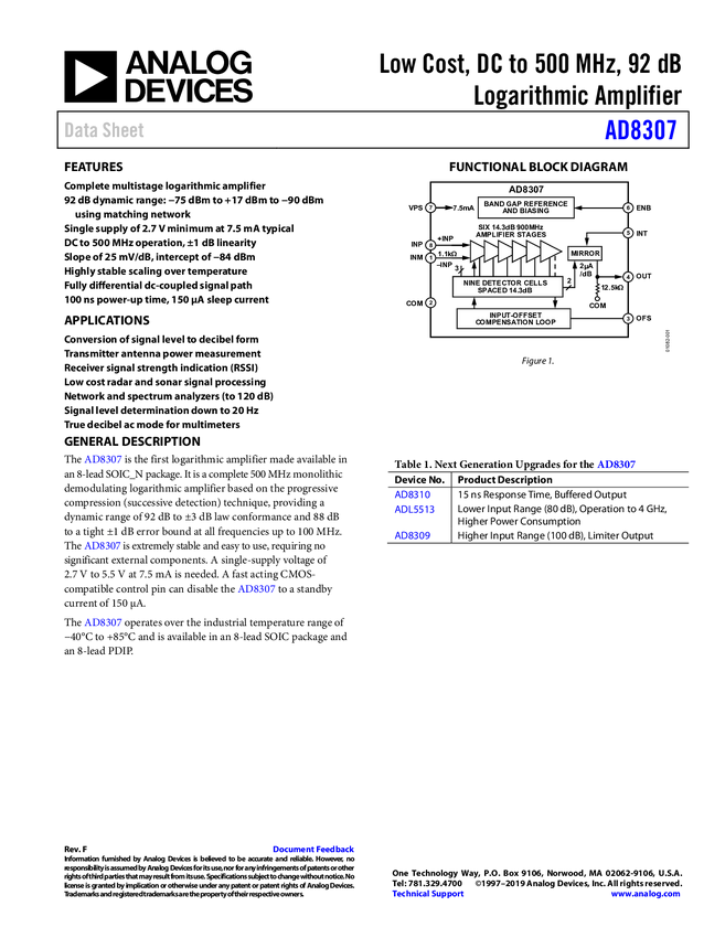 AD8307 Low Cost, DC to 500 MHz, 92 dB Logarithmic Amplifier