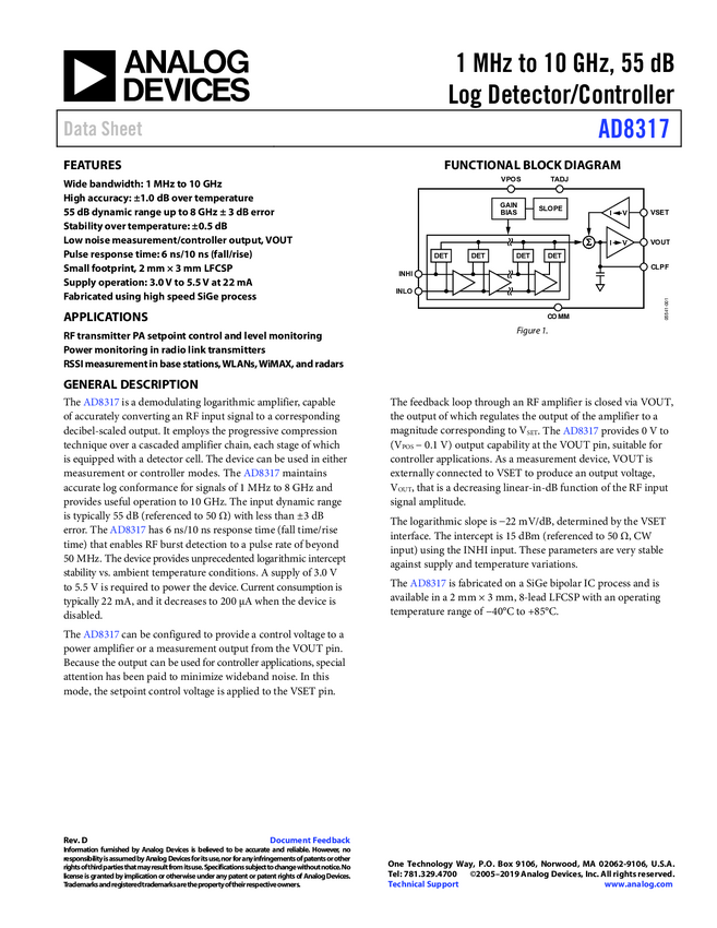 AD8317 1 MHz to 10 GHz, 55 dB Log Detector/Controller