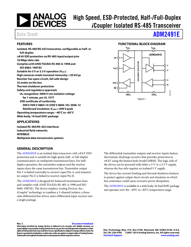 ADM2491E 5 kV Signal Isolated, High Speed (16 Mbps), ESD Protected, Full/Half Duplex...