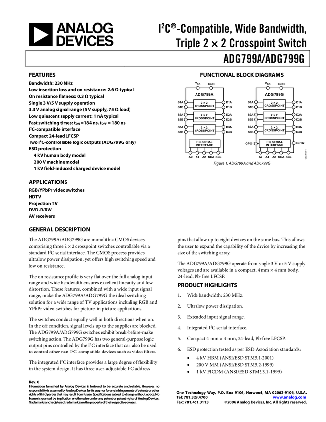 ADG799G IC® Compatible, Wide Bandwidth, Triple 2x2 Crosspoint Switch w/Two IC-Contr...