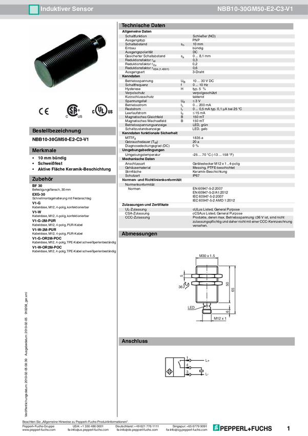 Pepperl+Fuchs Czujnik indukcyjny podtynkowy PNP NBB10-30GM50-E2-C3-V1