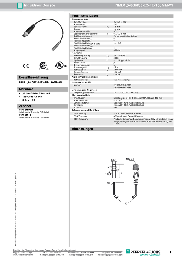 Pepperl+Fuchs Czujnik indukcyjny podtynkowy PNP NMB1,5-8GM35-E2-FE-150MM-V1