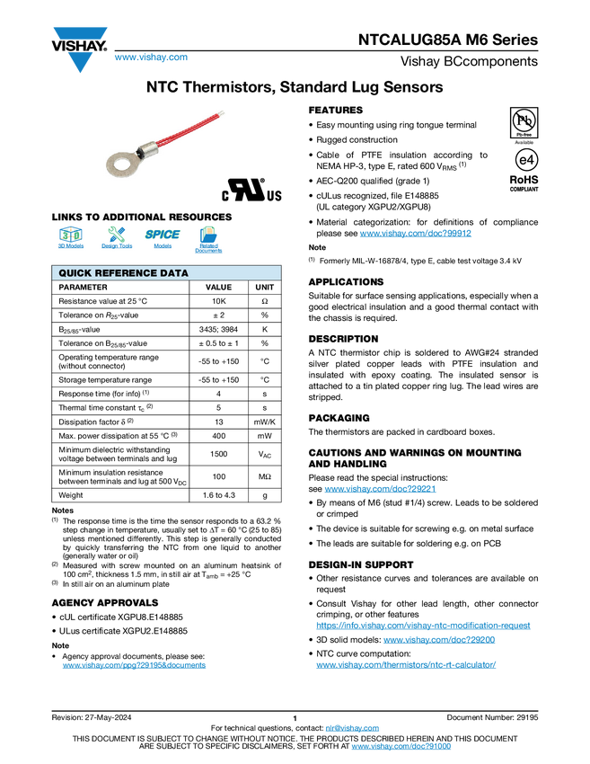 NTCALUG85A M6 Series NTC Thermistors, Standard Lug Sensors