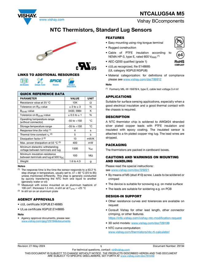 NTCALUG54A M5 NTC Thermistors, Standard Lug Sensors