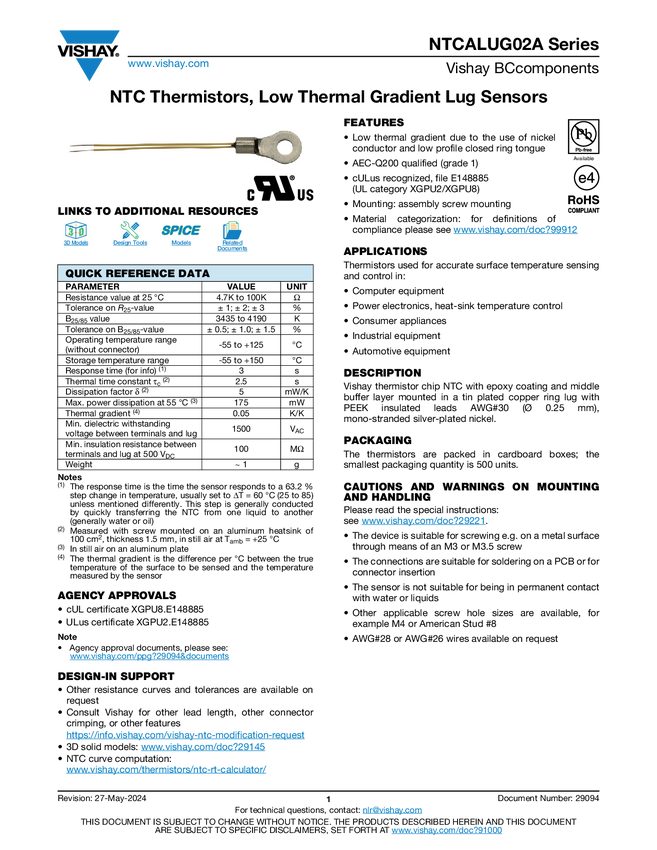 NTCALUG02A Series NTC Thermistors, Low Thermal Gradient Lug Sensors