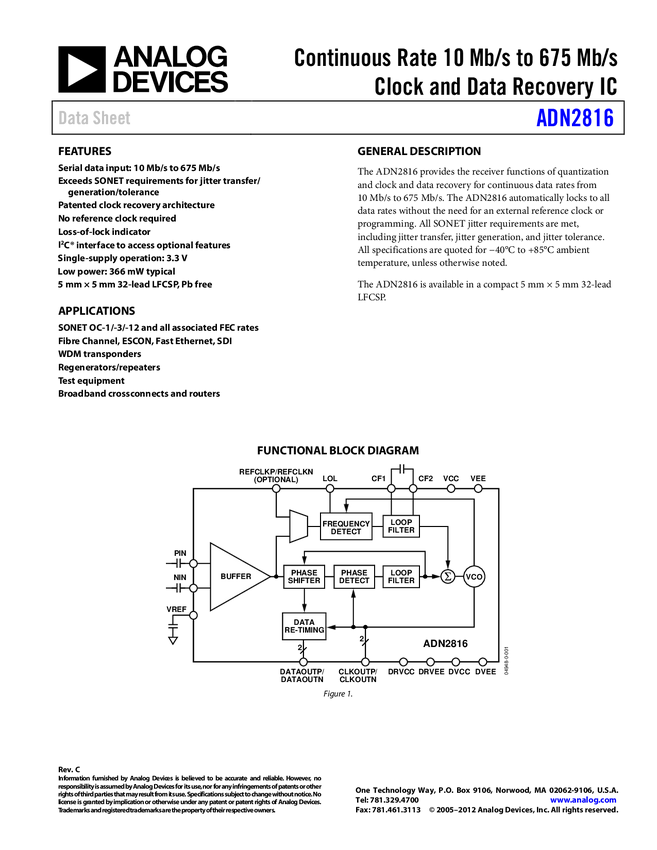 ADN2816 Continuous Rate 10 Mb/s to 675 Mb/s Clock and Data Recovery IC