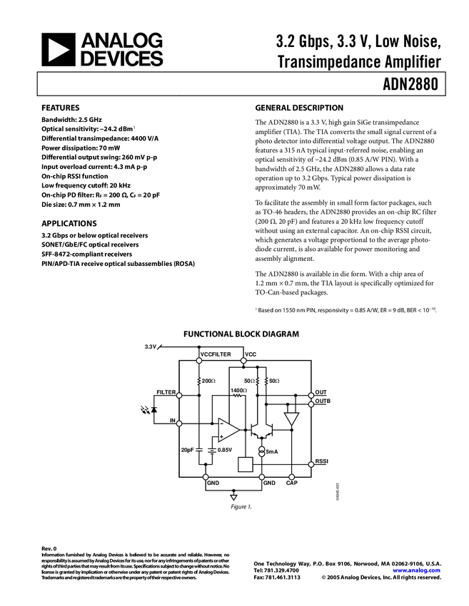 ADN2880 3.2 Gbps 3.3V Low Noise TIA for Small Form Factors
