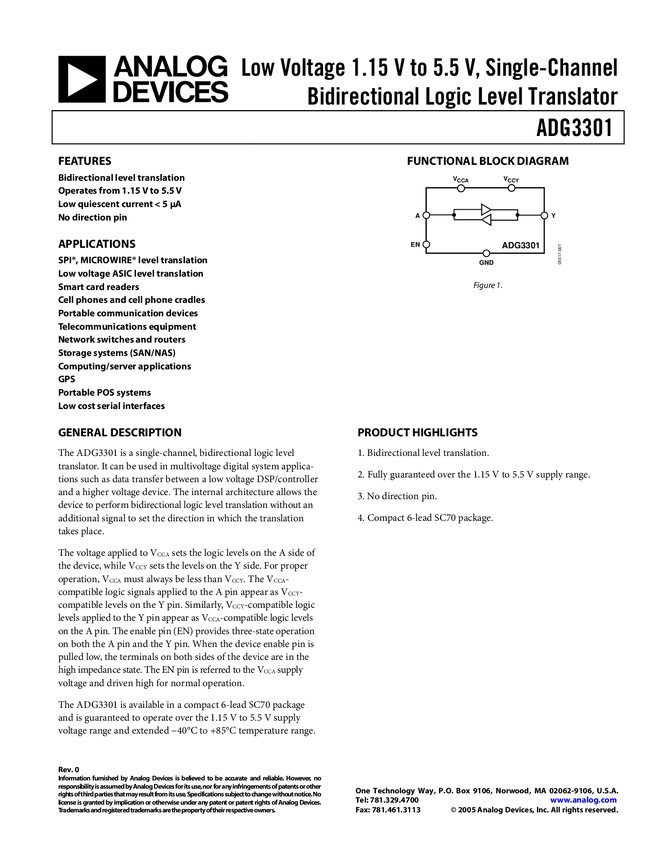 ADG3301 Low Voltage 1.15 V to 5.5 V, Single-Channel Bidirectional Logic Level Trans...