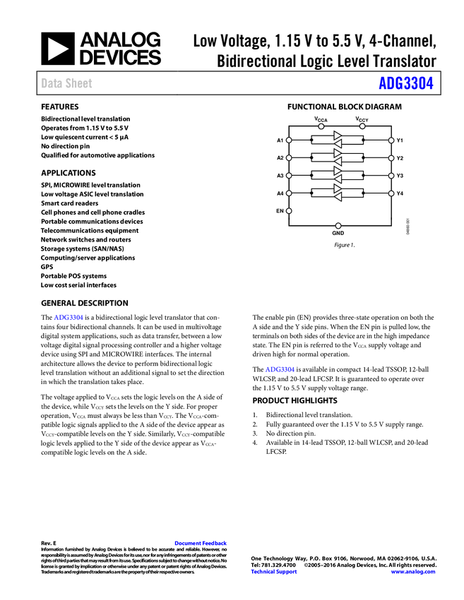 ADG3304 Low Voltage 1.15 V to 5.5 V, 4 Channel, Bidirectional, Logic Level Translat...