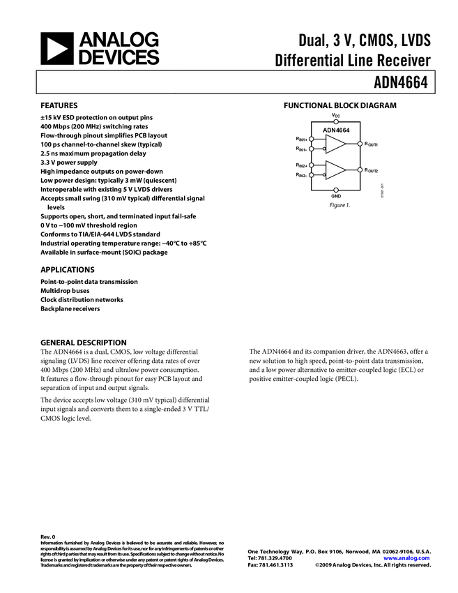 ADN4664 Dual, 3 V, CMOS, LVDS Differential Line Receiver