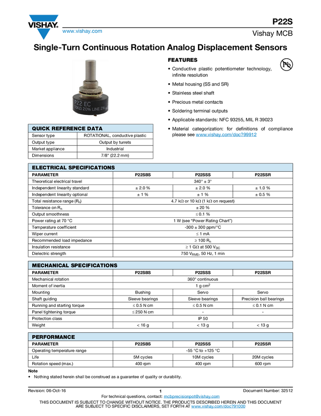 P22S Single-Turn Continuous Rotation Analog Displacement Sensors