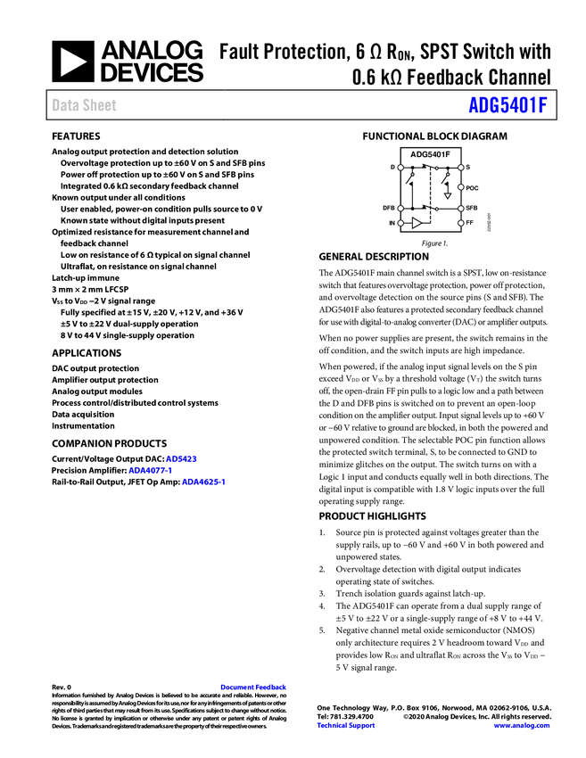 ADG5401F Fault Protection, 6 Ω R, SPST Switch with 0.6 kΩ Feedback Channel