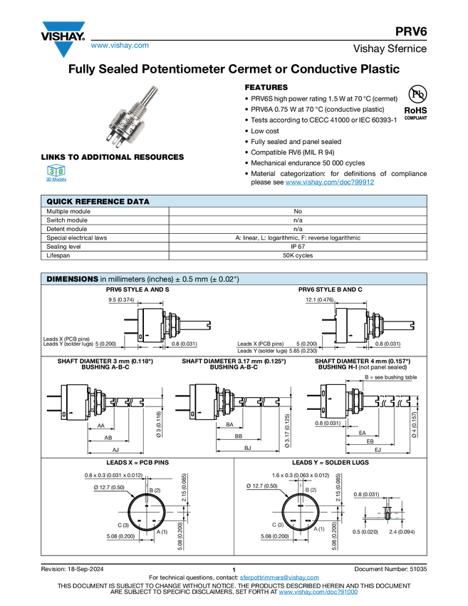 PRV6 Fully Sealed Potentiometer Cermet or Conductive Plastic