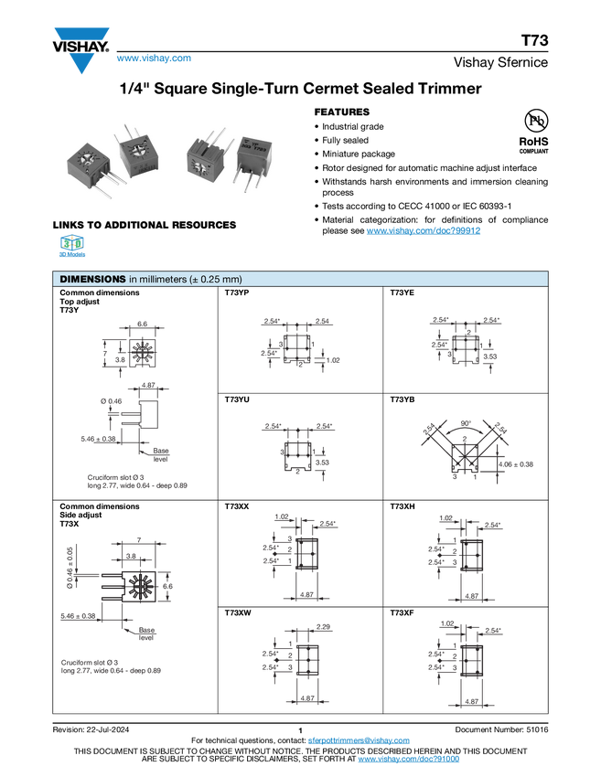 T73 1/4" Square Single-Turn Cermet Sealed Trimmer