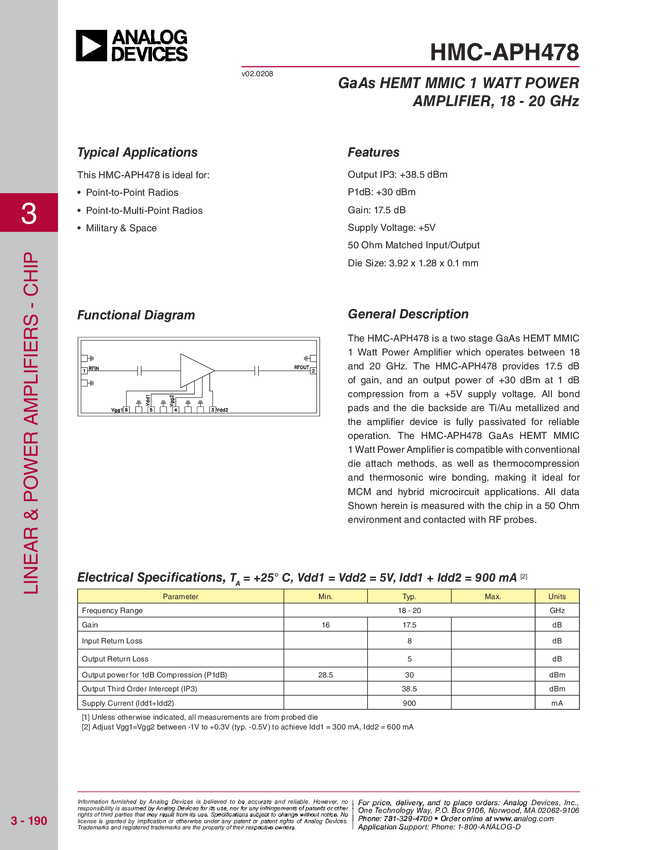 HMC-APH478-DIE 1 Watt Power Amplifier Chip, 18 - 20 GHz