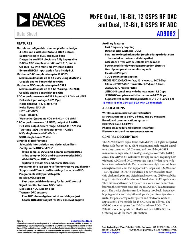 AD9082 MxFE Quad, 16-Bit, 12 GSPS RF DAC and Dual, 12-Bit, 6 GSPS RF ADC