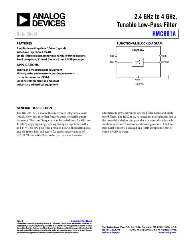 HMC881A 2.4 GHz to 4 GHz, Tunable Low-Pass Filter