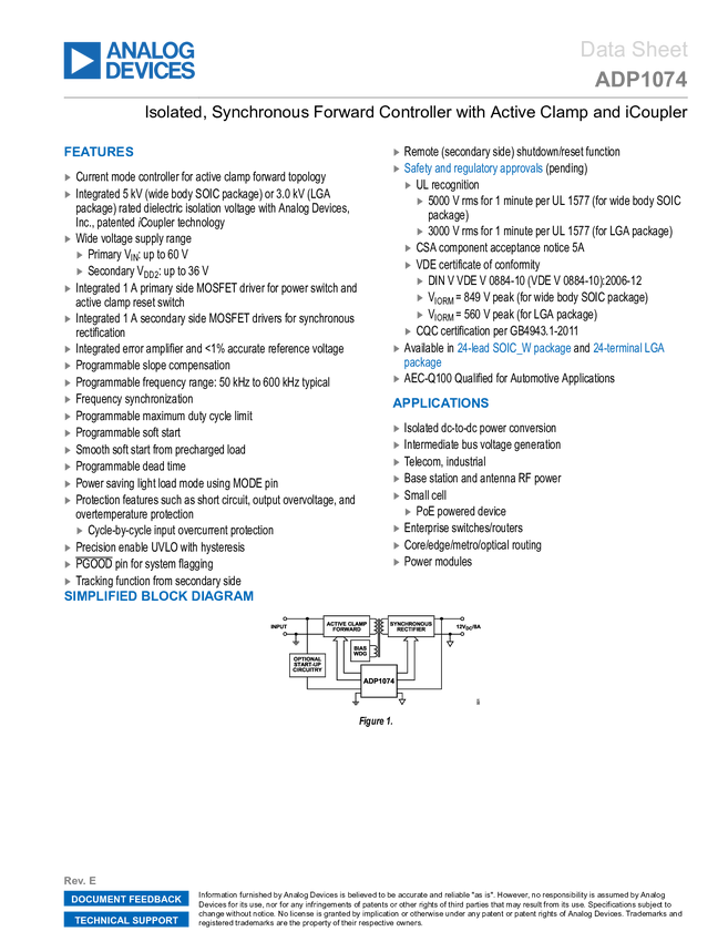 ADP1074 Isolated, Synchronous Forward Controller with Active Clamp and Coupler