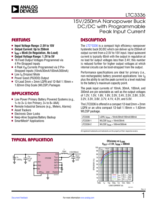 LTC3336 15V/250mA Nanopower Buck DC/DC with Programmable Peak Input Current