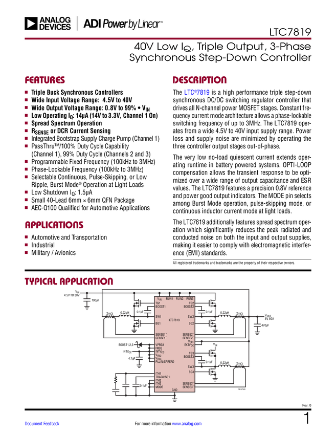 LTC7819 40V Low I, Triple Output, 3-Phase Synchronous Step-Down Controller