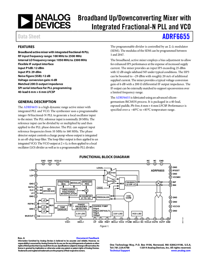ADRF6655 Broadband Up/Downconverting Mixer with Integrated Fractional-N PLL and VCO