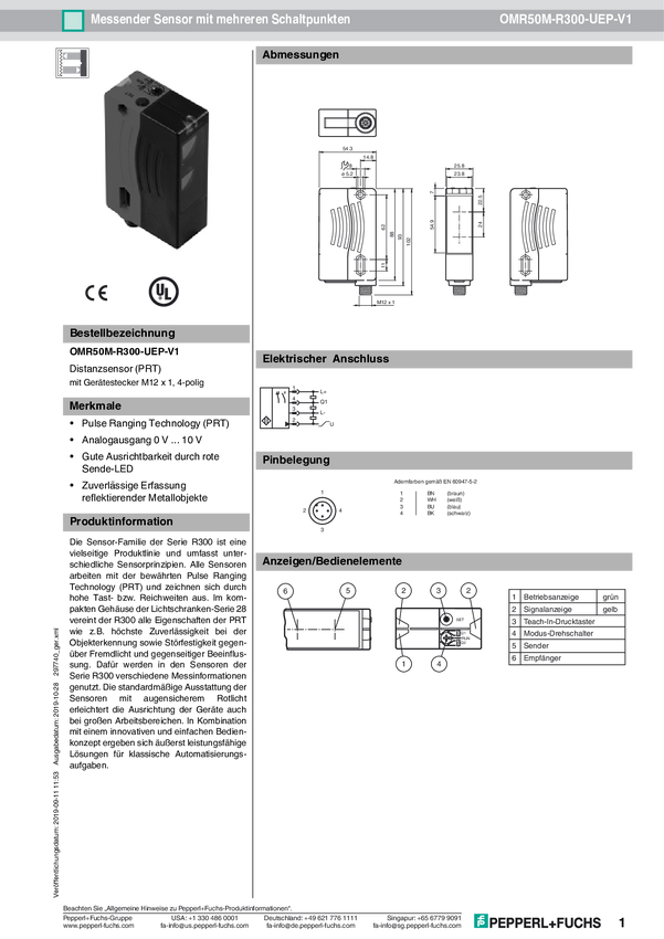 Pepperl+Fuchs OMR50M-R300-UEP-V1 Czujnik odległości 1 szt. (D x S x W) 54.3 x 25.8 x 88 mm