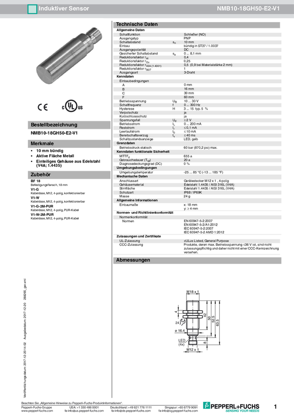 288265 Pepperl+Fuchs Czujnik indukcyjny podtynkowy PNP NMB10-18GH50-E2-V1