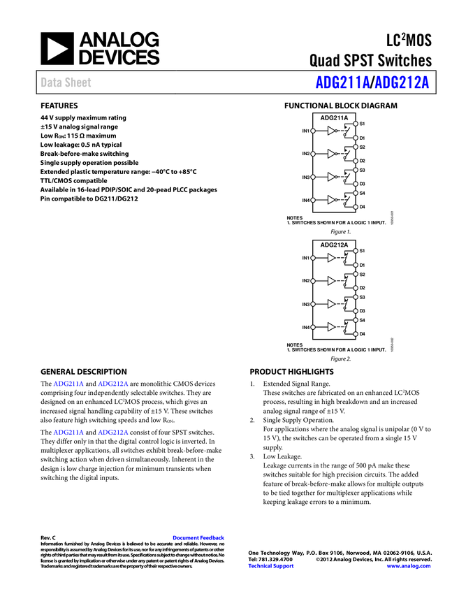 ADG211A LCMOS ±15 V Quad SPST Switch