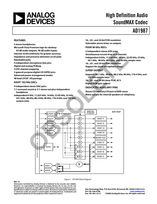 AD1987 HD Audio Codec, 8 DACs/4ADCs, Exceeds Microsoft Vista Premium Performance