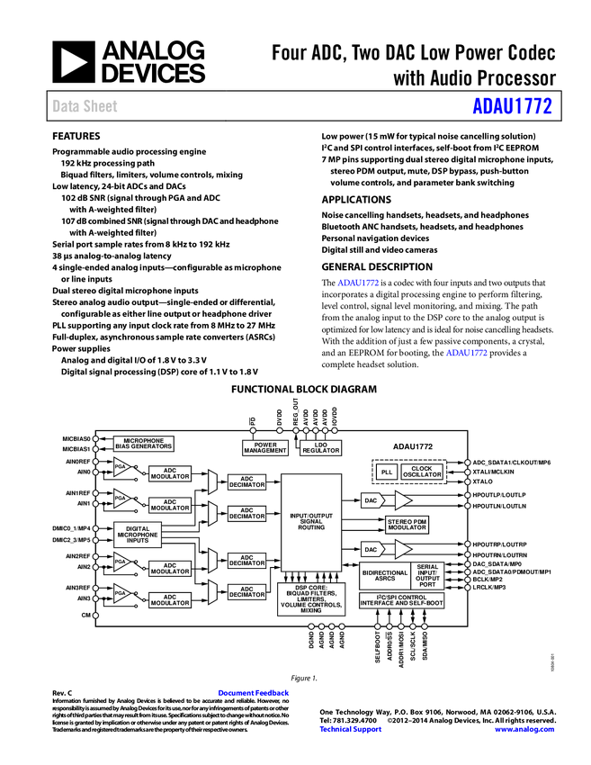 ADAU1772 4 ADC, 2 DAC Low-Power Codec with Audio Processor