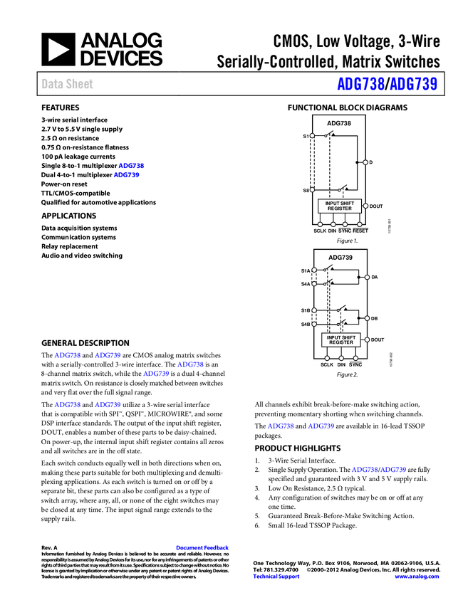 ADG739 CMOS, Low-Voltage, 3-Wire Serially-Controlled, Matrix Switch