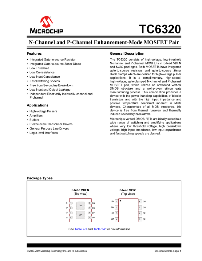 TC6320 N-Channel and P-Channel Enhancement-Mode MOSFET Pair Data Sheet