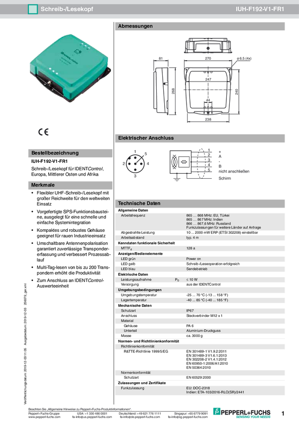 Pepperl+Fuchs 256079 Głowica odczytu/zapisu RFID IUH-F192-V1-FR1 1 szt.