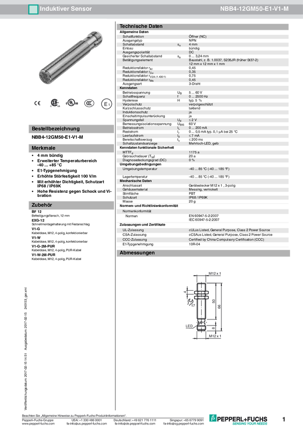 240153 Pepperl+Fuchs Czujnik indukcyjny podtynkowy NPN NBB4-12GM50-E1-V1-M