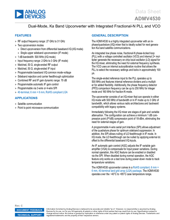 ADMV4530 Dual-mode, Ka Band Upconverter with Integrated Fractional-N PLL and VCO