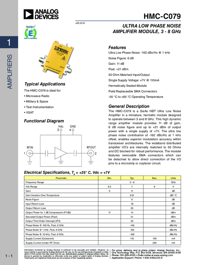 HMC-C079 Ultra Low Phase Noise Amplifier Module, 3 - 8 GHz