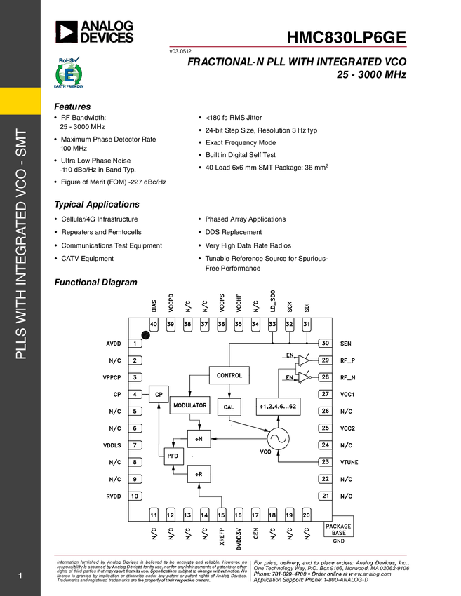 HMC830 Fractional-N PLL with Integrated VCO SMT, 25 - 3000 MHz