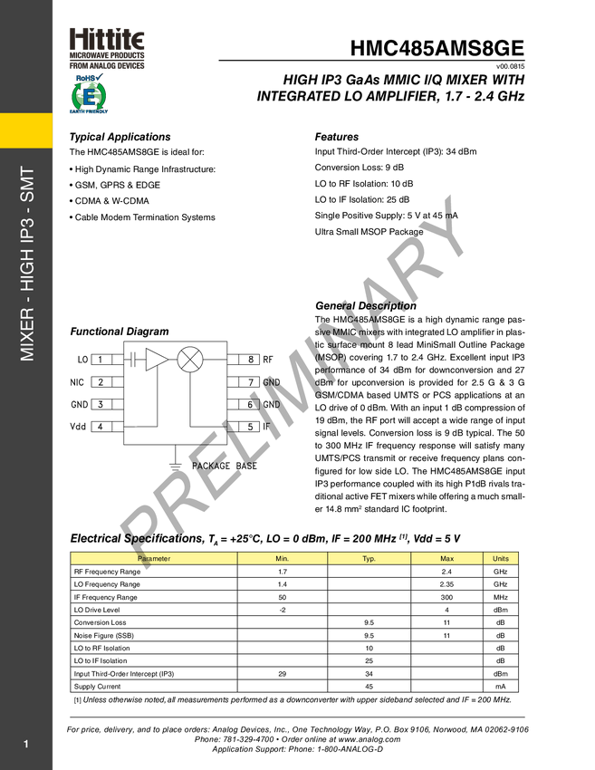 HMC485A High IP3 Mixer SMT w/LO Amplifier, 1.7 - 2.4 GHz